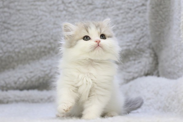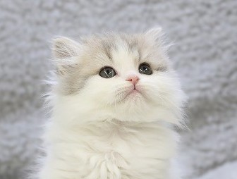 ブルータビー&ホワイトのやさしい色合いに、もふっとした被毛が映える男の子。写真でも分かるまん丸おめめと、きゅっと上を向く表情がたまらない可愛さです 💕 ふわふわの胸元と、ちょこんとしたおててで「抱っこして?」と語りかけてくるような雰囲気。