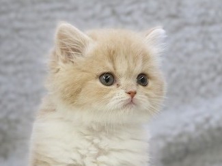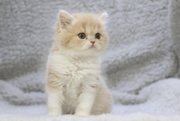 クリームタビー&ホワイトのやさしい色合いが、とにかく甘くて上品。写真でも分かるまん丸の瞳と、もふっとした胸元の毛並みがたまらない可愛さです 💖 ちょこんと座る姿だけで「ぬいぐるみ感」満点。お部屋の空気が一気に癒しモードになります。