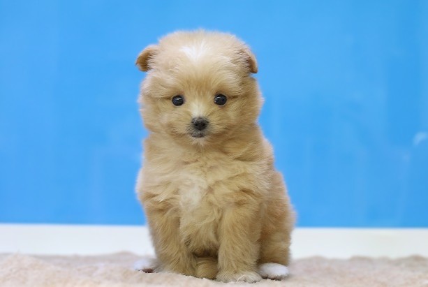 写真でも分かる、ふんわりアプリコットカラーに、つぶらな瞳がとびきり可愛い女の子。ポメのもこもこ感と、プードルのやさしい雰囲気が合わさったような“ぬいぐるみ顔”で、見つめられるだけでキュンとします 💕 今は400gととっても小さく、抱っこすると軽さにびっくりする可愛さです。