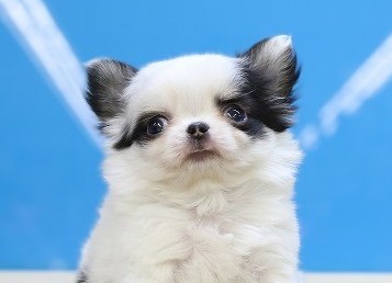ちょこんと王子、ホワイト&ブラックの“きゅん顔”チワワくん✨ 写真の通り、まんまるおめめと小さなお鼻がたまらないロングコートの男の子です💗 ホワイトにブラックの差し色が入った配色は、可愛さの中にキリッとした魅力もあって写真映え抜群。抱っこすると軽さにびっくりするサイズ感です。