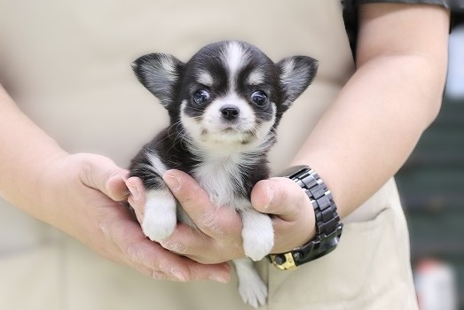 手のひらにすっぽり、ちいさなアイドル✨ ブラックタン&ホワイトの王道トライカラーで、お顔の模様がくっきり可愛いロングコートチワワちゃんです💗 写真の通り、手の中でちょこんとおすまし…このサイズ感は反則級。見つめられたら即アウトです。