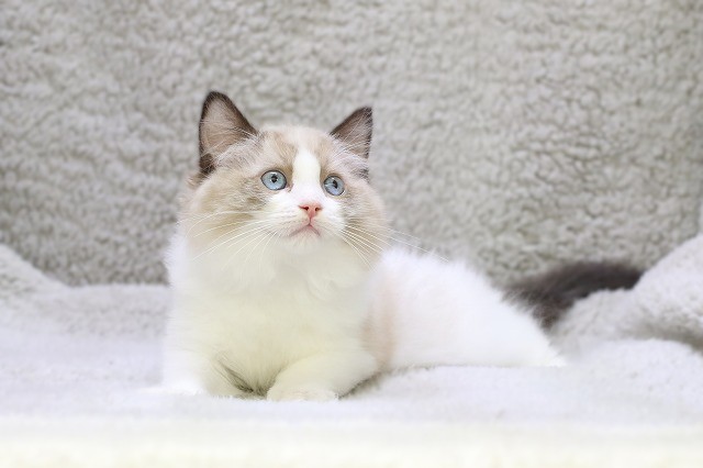 シールポイントバイカラーらしい上品な色合いと、ふわふわの毛並みが魅力のラグドールちゃん。写真でも伝わるやさしい表情で、見つめられるとつい時間を忘れます。将来は4kg~8kgほどのしっかりボディに成長しやすく、家族のそばでのんびり寄り添ってくれるタイプになりやすいのも嬉しいポイントです。