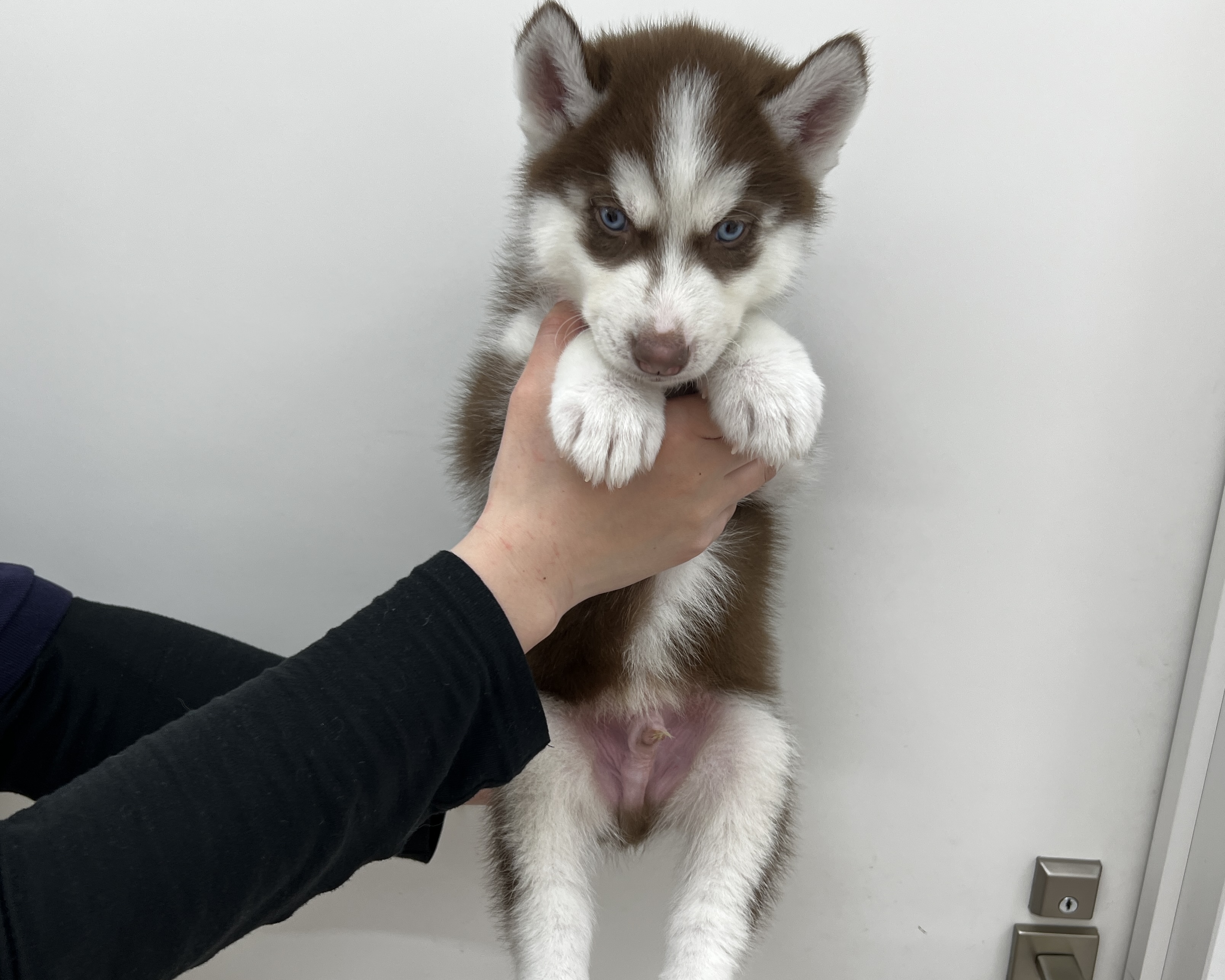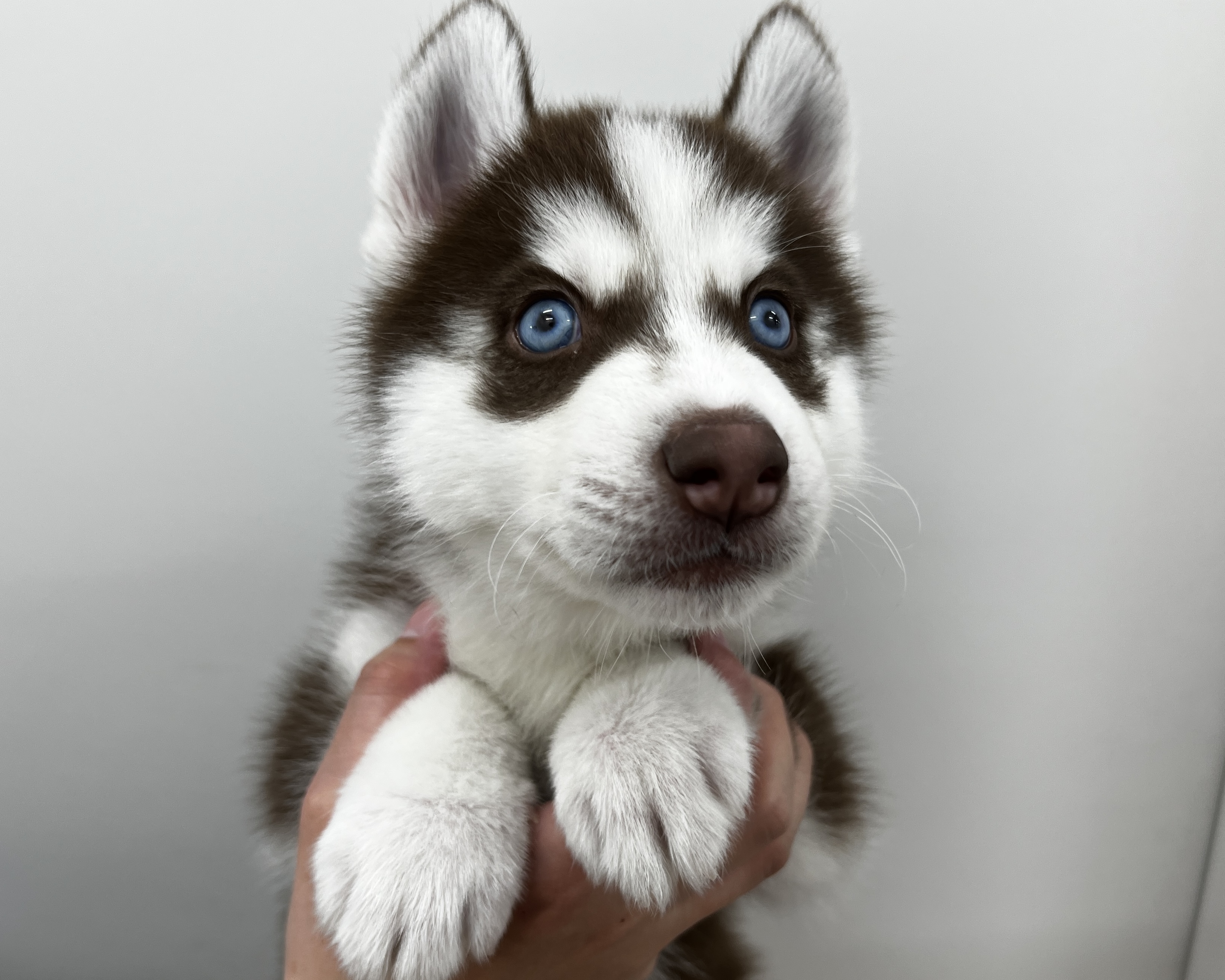 チョコ&ホワイトの美しい毛色はとても珍しく、ハスキー特有の凛々しい顔立ちと相まって存在感抜群🌟