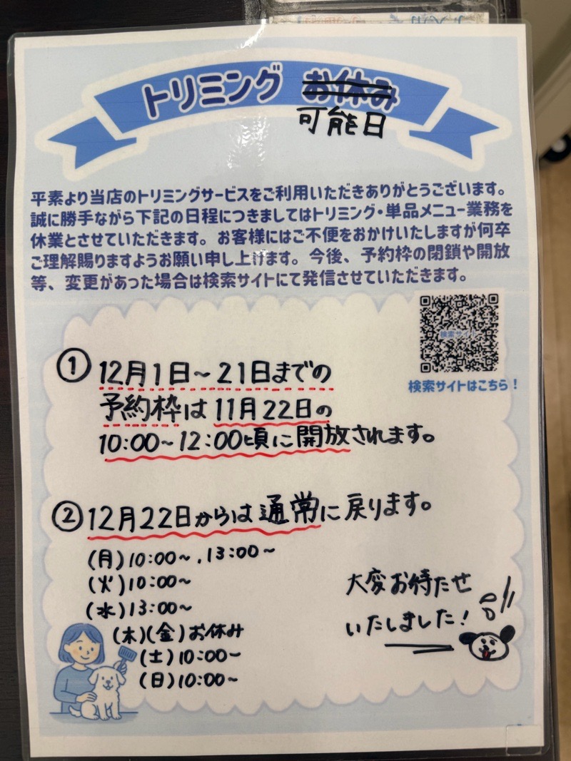 ◾️12月トリミング についてのお知らせ‼️(2025.11.17更新)